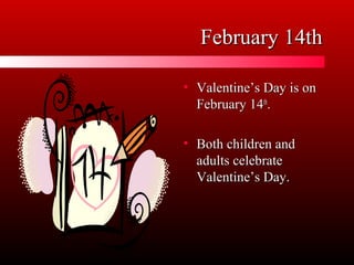 Valentine's Day is celebrated on February 14th. Both children and adults celebrate by marking calendars, exchanging Valentine's Day cards and gifts, giving chocolate candy and flowers. Popular Valentine's Day symbols include Cupid, hearts, and red boxes of chocolate candy.