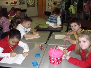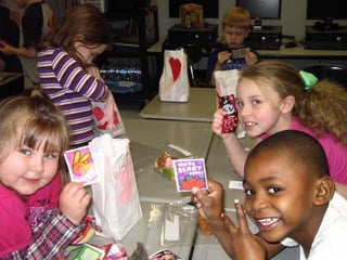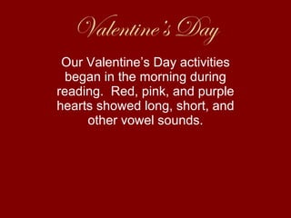 The students had Valentine's Day activities during their reading lesson focusing on heart shapes and vowel sounds. They then enjoyed a Valentine's Day party with snacks provided by parents, though some were less healthy than others. Finally, they opened Valentine's Day cards and read the sweet messages to their friends, making it a great day.