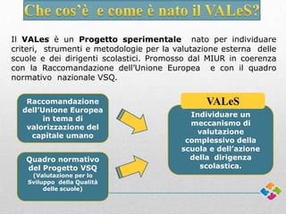 Il progetto Vales è un'iniziativa sperimentale per migliorare la valutazione delle scuole e dei dirigenti scolastici in Italia, promossa dal MIUR. Il progetto prevede fasi di autovalutazione, valutazione esterna e creazione di un piano di miglioramento sulla base di dati e feedback. Sono coinvolti vari attori, tra cui docenti, genitori e ispettori, per garantire un approccio completo alla qualità dell'istruzione.