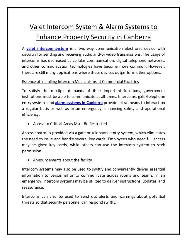 The document discusses the Valet Intercom and alarm systems in Canberra, highlighting their role in enhancing property security and communication. Despite a decline in intercom usage due to modern technology, they remain essential for commercial and government facilities for access control and emergency communication. Intercom systems facilitate communication for personnel and provide quick alerts and instructions during emergencies.