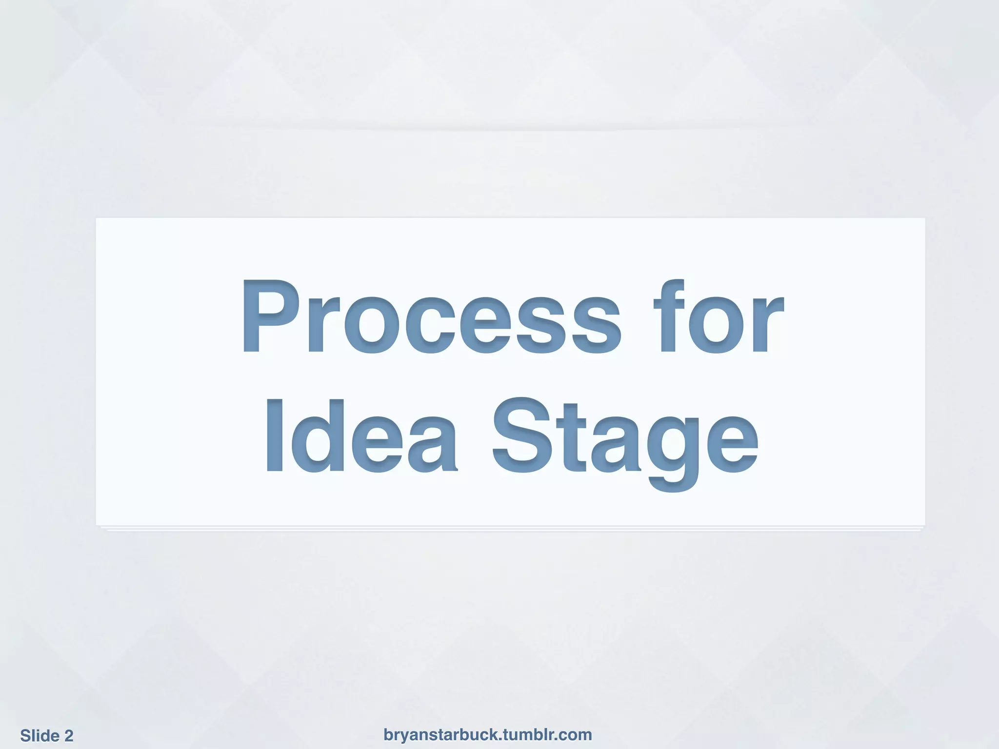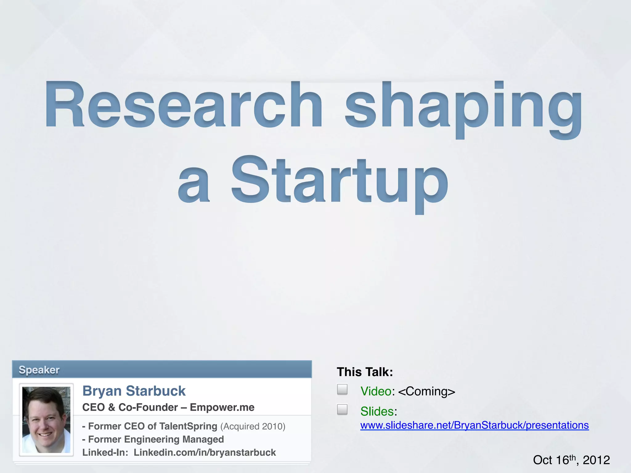 Bryan Starbuck provides a presentation on research shaping startups. He outlines a 4 step process for validating startup ideas: 1) develop a list of ideas, 2) build a pitch deck for the top idea, 3) validate the idea with target customers, and 4) if it passes validation then build the startup, if it fails then repeat the process. Starbuck emphasizes the importance of validating business models and ideas by talking to potential customers and getting feedback on pitch decks to identify weaknesses or blind spots before fully developing a startup.
