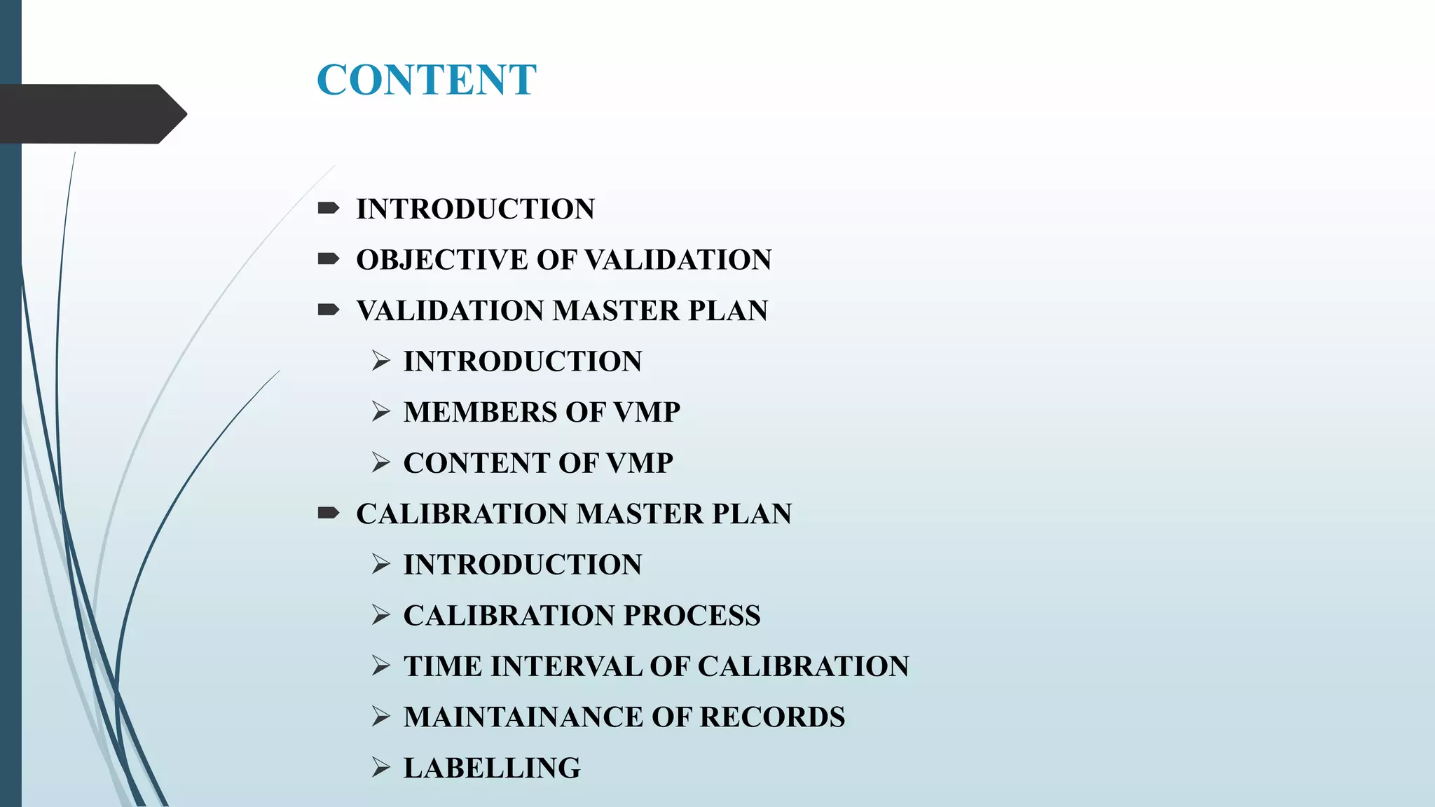 This document outlines validation and calibration master plans. It discusses the objectives of validation including reducing risks and costs. It describes the contents and members involved in a validation master plan, which provides the framework for validation activities. It also discusses the calibration process, including defining calibrated equipment, classification, and verification. The calibration master plan establishes requirements for an effective calibration control program.