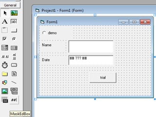 2) The MaskedEdit control formats user input using a mask and prevents invalid characters. It is bound to data controls to display and update field values.