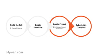 The document provides a step-by-step guide for submitting a project to Citymart.com for validation. It outlines the five steps to validate a project: 1) create a project, 2) write up project facts, 3) invite stakeholders to validate, 4) stakeholders validate the facts, and 5) the project is validated once three stakeholders have validated the facts. It emphasizes the importance of validation for completing submissions and gaining trust from potential clients.