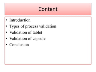 This document discusses the validation process for solid dosage forms such as tablets and capsules. It begins with an introduction to process validation and its importance in ensuring product quality. The main types of process validation are then described: prospective, concurrent, and retrospective. Specific steps in tablet and capsule manufacturing that require validation are also outlined, including validation of raw materials, analytical methods, equipment, and process parameters. Key factors considered during validation of processes like blending, granulation, drying, and milling are defined. The overall goal of process validation is to provide high assurance that the manufacturing process will consistently produce products meeting quality standards.