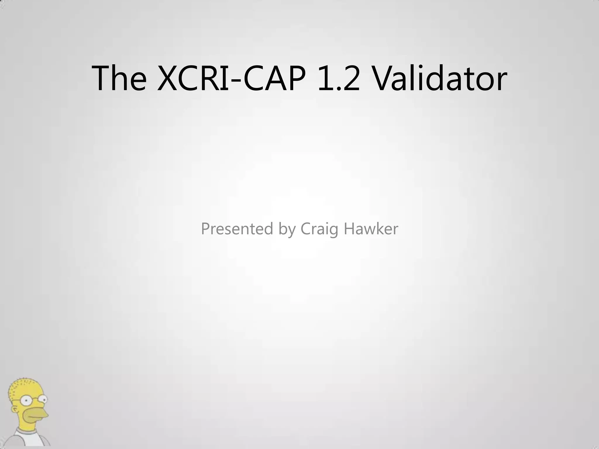 The document discusses the XCRI-CAP 1.2 Validator, which aims to validate XML course data feeds against the XCRI-CAP 1.2 standard to ensure quality and consistency. It validates at the XML structural level using XML schemas, and also performs rule-based validation against the XCRI data definitions and vocabulary. The validator provides feedback on issues it finds, grouped by severity. It advises using the online validator first or downloading the open source code.