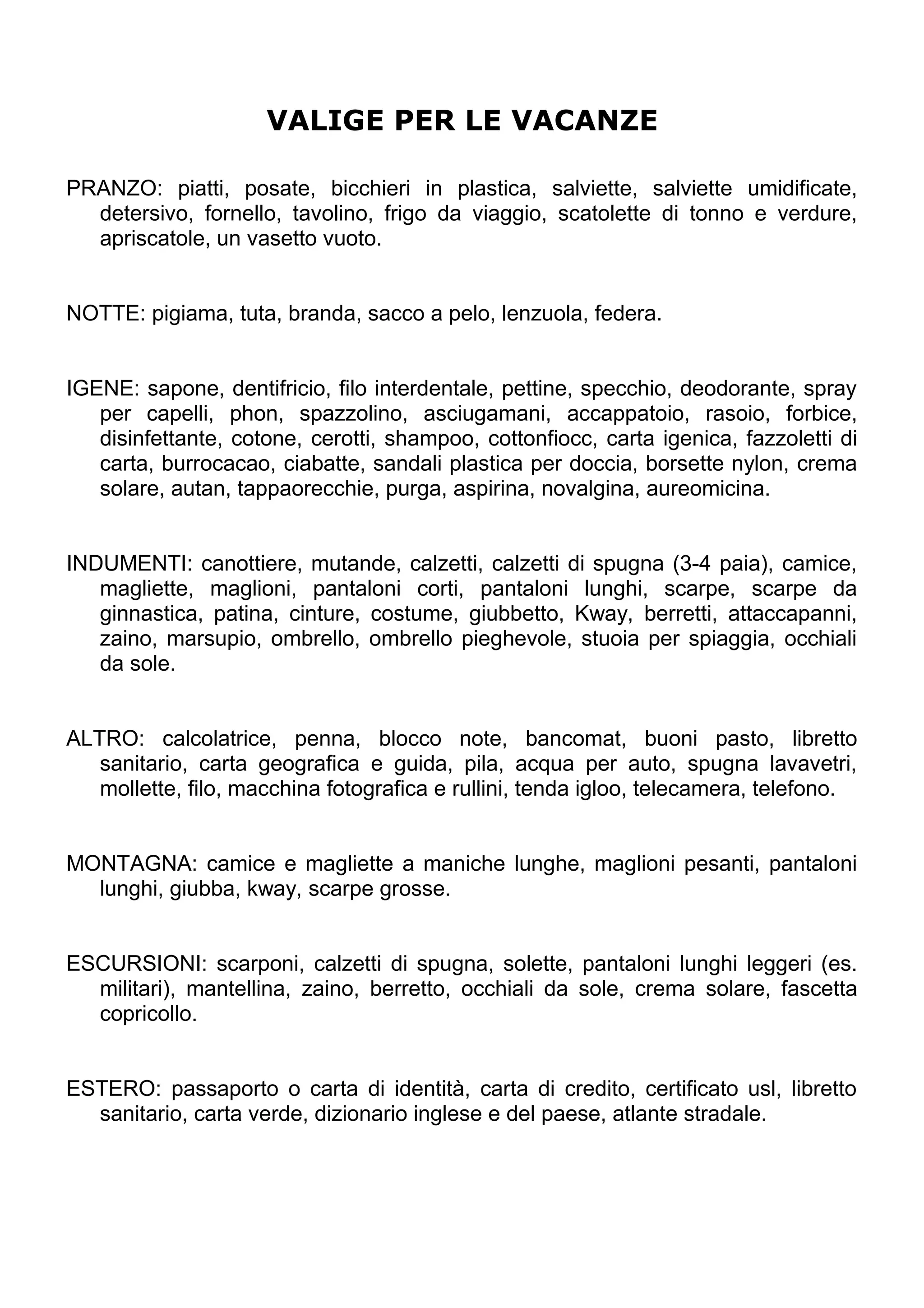 Il documento elenca gli elementi essenziali da portare in vacanza, suddivisi per categorie come cibo, igiene, indumenti, e attrezzature. Include oggetti necessari per diverse attività come campeggio, escursioni e viaggi all'estero, nonché requisiti per la preparazione dell'auto. Infine, viene fornita una guida per assicurarsi di avere tutto il necessario per una vacanza confortevole e sicura.