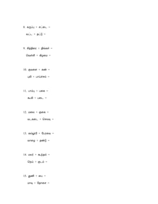 ºð¨¼ = Åð¼ + ¾ðÎ = 9. º¢ò¾¢¨Ã + ¾¢í¸û = ¦ÅûÇ¢ + ¸¢Æ¨Á = 10. ÌÅ¨Ç + ¸ñ = ÒÄ¢ + À¡öîºø = 11. À¡õÒ + À¨¸ = ÜÄ¢ + À¨¼ = 12. Á¨Ä + ̨¸ = ż¸¨¼ + ¦ºÄ× = 13. ¸øæÃ¢ + §ÀèŠ= Å¡¨Æ + ¾ñÎ = 14. ÁÄ÷ + Üó¾ø = ¦¿ö + ̼õ = 15. н¢ + ¨À = Á¡× + §¾¡¨º =