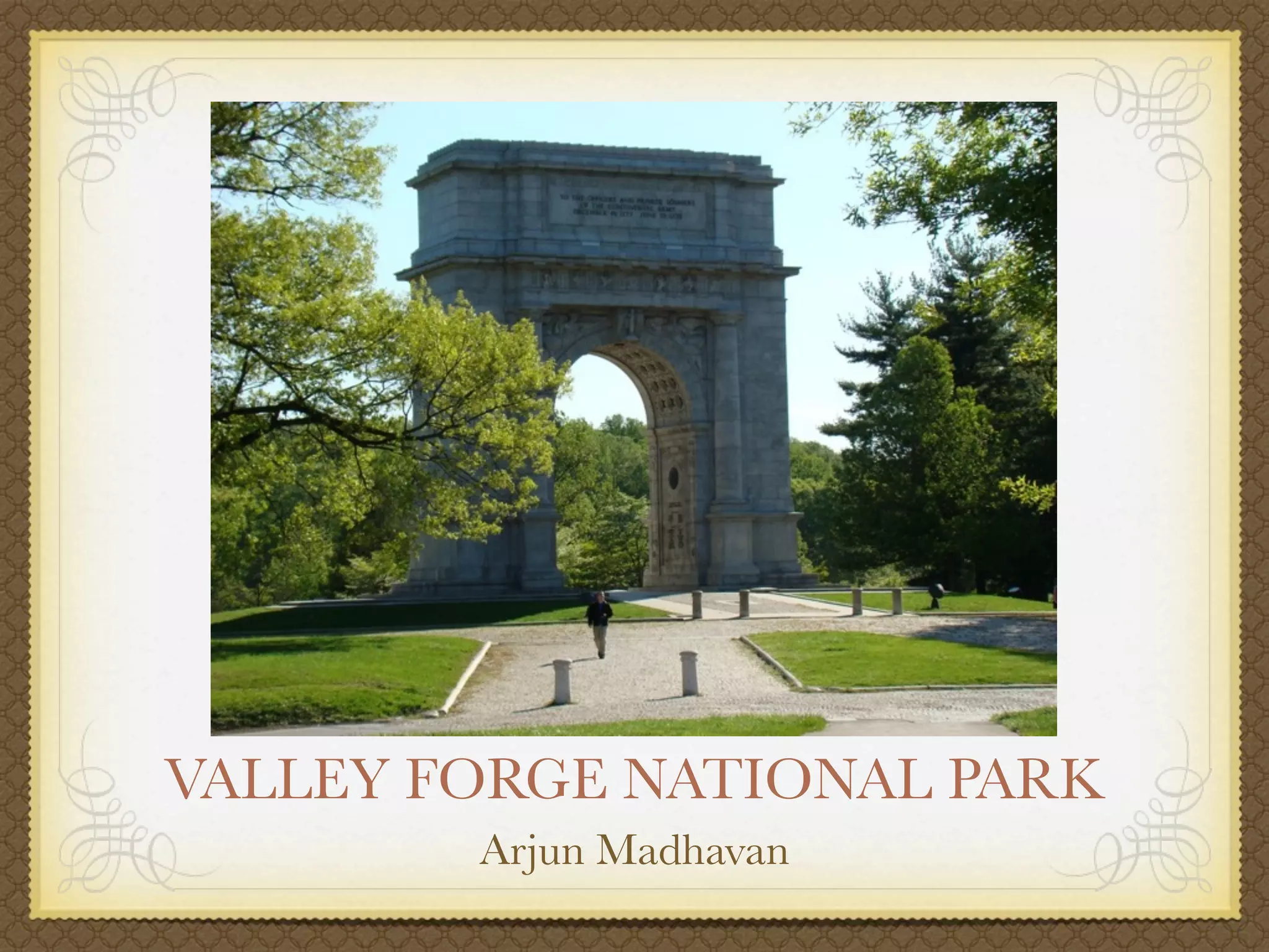 Valley Forge National Park serves as a reminder of the sacrifices made during the Revolutionary War. The park's 3,600 acres contain rolling hills that provide an example of conservation efforts. During the winter of 1777, over 12,000 American soldiers arrived at Valley Forge to camp for the winter, facing shortages of food, clothing, and medical supplies that led to starvation, disease, and death for many troops. Today the park works to preserve the landscape and history while addressing issues like invasive plant species and overpopulation of deer.