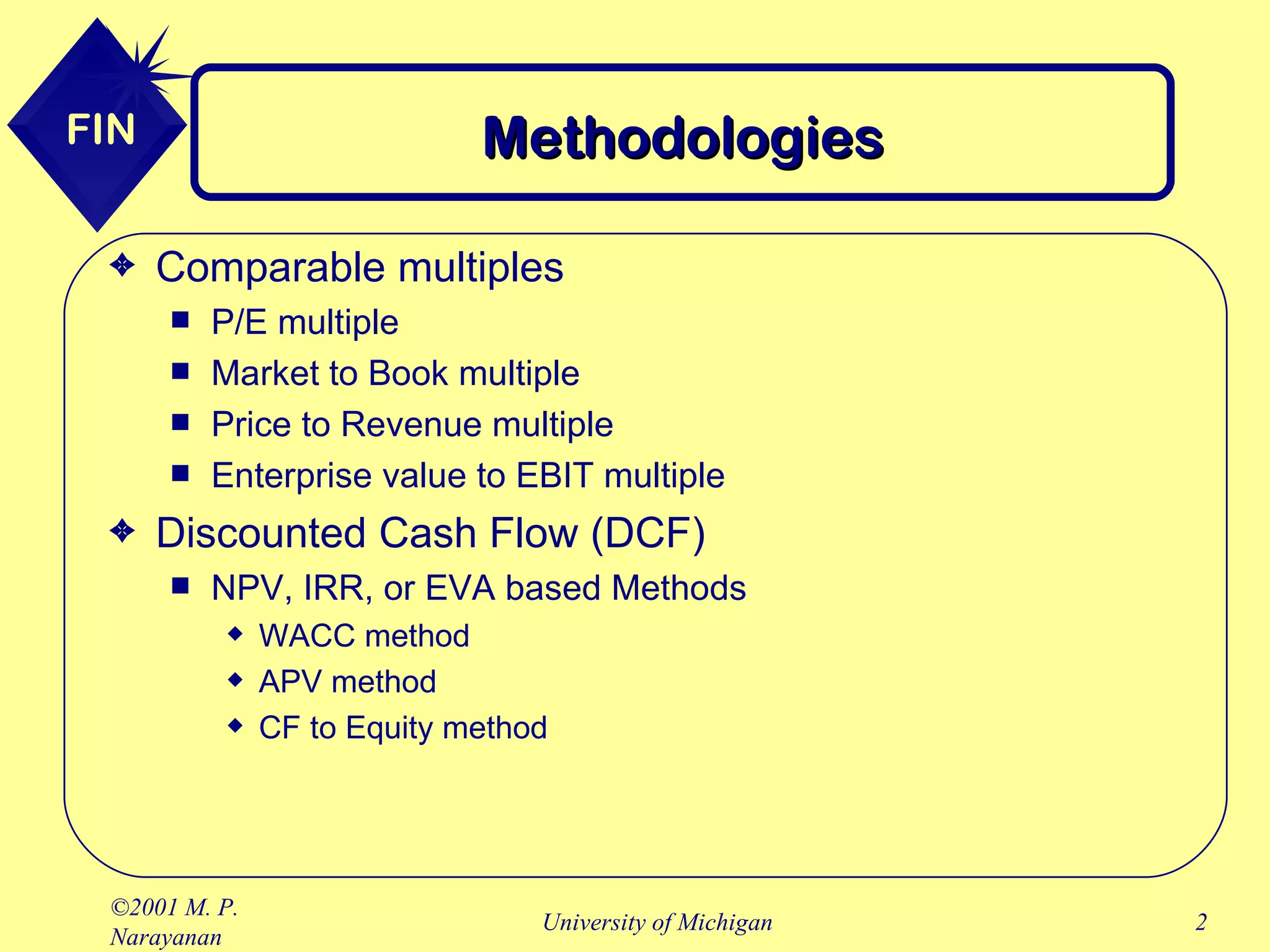 This document discusses several valuation methods including comparable multiples, discounted cash flow analysis, and heuristic methods. It provides an overview of comparable multiples like P/E, price to book, and enterprise value to EBITDA. It then describes using a discounted cash flow approach including estimating free cash flows, determining an appropriate time horizon, and calculating the cost of debt and equity. The document emphasizes that discounted cash flow analysis accounts for synergies and specific company characteristics better than heuristic multiples which have limitations.