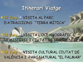 ValèNcia 2008 09 1. 2. Itinerari Viatge 17 Juny VISITA AL PARC D’ATRACCIONS “TERRA MÍTICA” 18 Juny VISITA L’OCEANOGRÀFIC, L’ HEMISFERIC I CIUTAT DE LES CIÈNCIES. 19 Juny VISITA CULTURAL CIUTAT DE VALÈNCIA I PARC NATURAL “EL PALMAR” 3. 4. 5. 6. 7. 8. 9. 10. 11. 12. 13. 14. 15. 16. 17. 18. 19. 20. 21. 22. 23. 24. Torre Miguelete MIGUELETE I TOTS ELS SEUS DETALS ARQUITECTÒNICS. ALGUNS ALUMNES VAREN PUJAR L’ESCALA DE CARAGOL I VAREN PODER OBSERVAR TOTA LA CIUTAT DE VALÈNCIA DES DE LO MÉS ALT DE LA TORRE. 25. 26. 27. 28. AQUESTA ÉS LA FAMOSA I CONEGUDA BARRACA VALENCIANA, VIVENDA TÍPICA DELS LABRADORS DE L’ HORTA I DE L’ALBUFERA VALENCIANA. BARRACA VALENCIANA 29. 30. 31. 32. 33. 34. 35. 36.