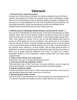 Valoració 1. Pensament abans i després del projecte Ha sigut mes o menys el que em pensava. Una setmana dedicada a buscar informació, redactar i anar penjantho tot al bloc. Era conscient de que seria un treball llarg y complet. Però com no m’he estressat crec que he assolit els objectius proposats, exceptuant certs punts que no han sigut exactament com volia. Però en general crec que ha estat bé i ens hem ajudat mútuament. També crec que està bé ja que de cara al treball de 2n de batxillerat podem aprendre dels errors que hem tingut aquest cop. 2. Reflexió sobre la metedología (treball individual, alumnes fent de “profes”...) Crec que ferho