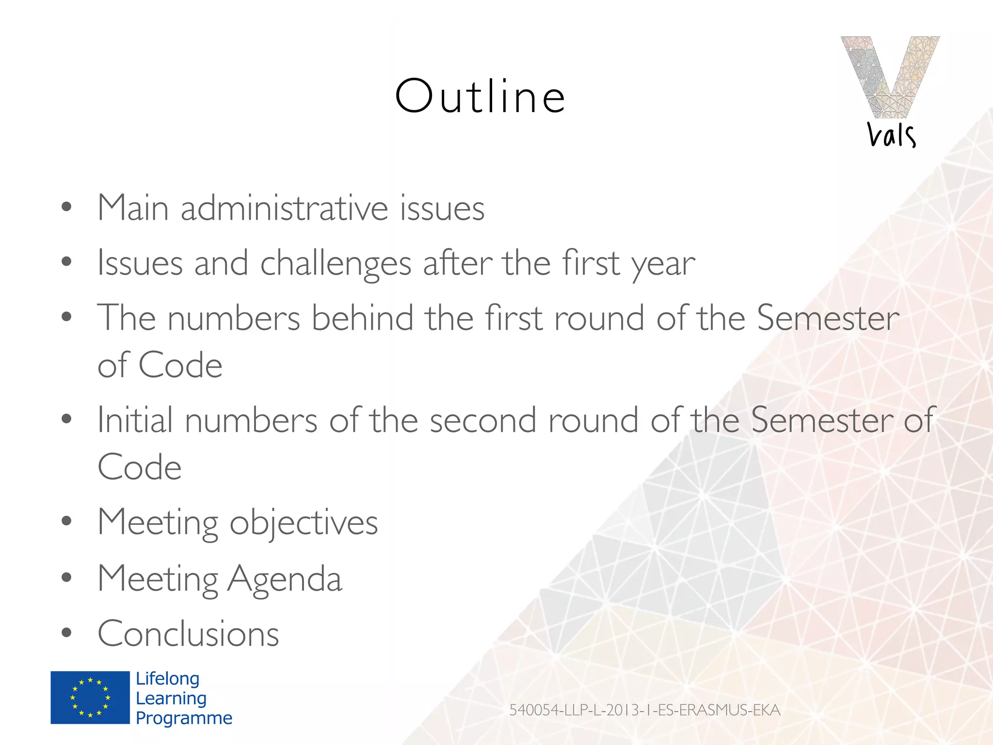 The document summarizes the third meeting of the VALS project, which took place in Udine, Italy on February 23-24, 2015. The meeting addressed administrative and financial issues, reviewed progress on the first year's activities and initial results of the second round of the Semester of Code virtual placements. Key objectives of the meeting were to discuss work package deliverables, identify reporting responsibilities, and address challenges in increasing student and university engagement in the project. Overall conclusions focused on making the virtual placement process more flexible to increase participation.