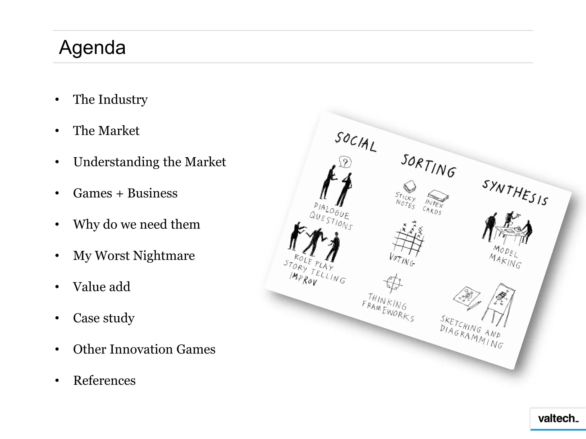 This document discusses using games to promote innovation in business contexts. It begins by providing background on the gaming industry and market. It then explains that games can be used to optimize collaboration, enable ideation, provide business insights, and make learning fun. Several case studies are presented that show how companies have used innovation games to understand customers, discover unmet needs, build consensus, and gather feedback. Specific games discussed include My Worst Nightmare, Spider Web, Speed Boat, Buy a Feature, and 20/20 Vision. The document argues that innovation games provide value by helping organizations know their customers, find unspoken needs, build trust with stakeholders, and validate requirements.
