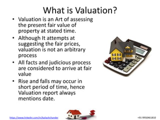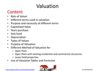 - Valuation considers factors like supply/demand, purpose of valuation, and methods differ for open plots, existing structures, and leasehold properties.