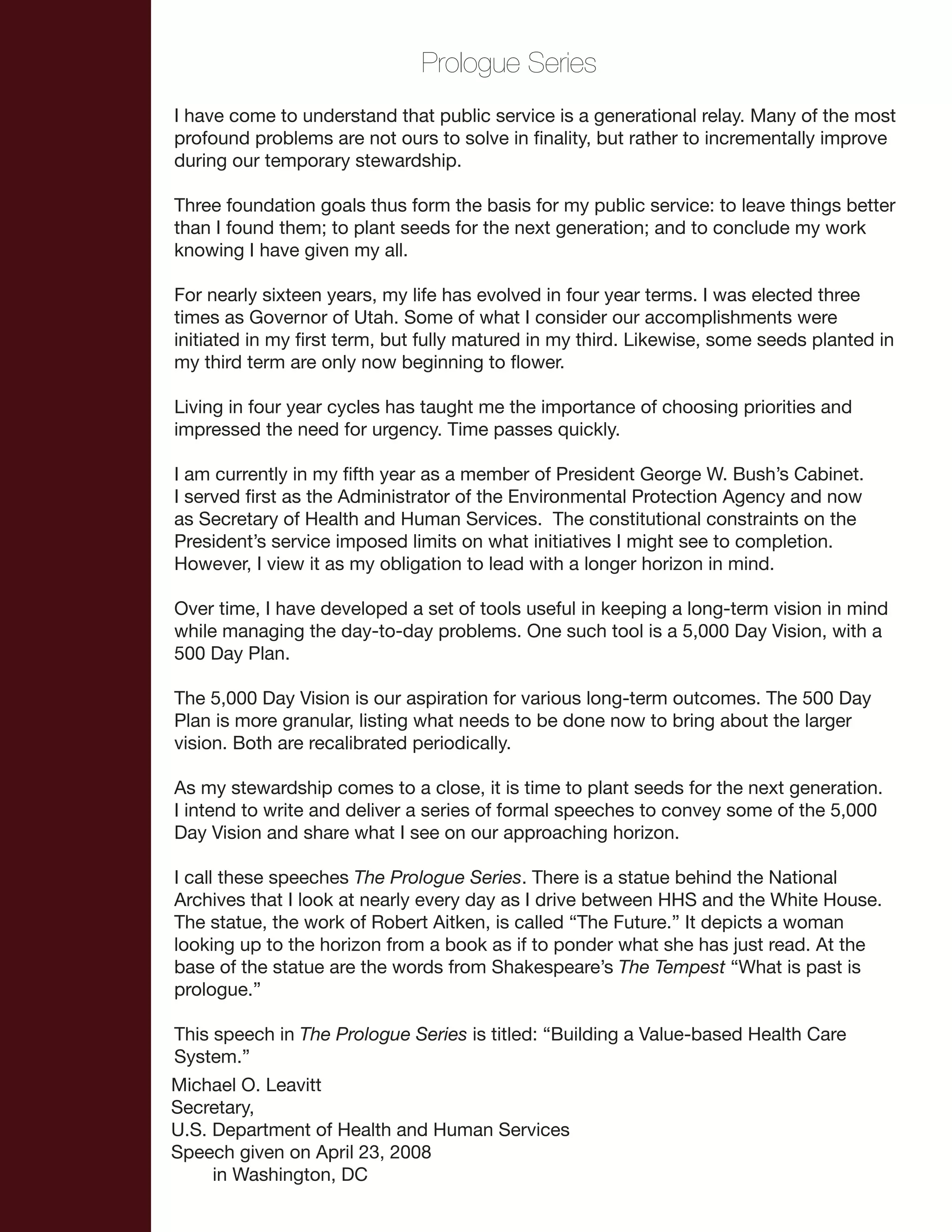 The document summarizes the progress made toward building a value-based healthcare system in the United States over the past 3 years under Secretary Michael Leavitt. It outlines the 4 cornerstones of this movement: 1) standard quality measures, 2) cost comparisons, 3) interoperable health records, and 4) incentives. For each cornerstone, it provides examples of progress made as well as continued challenges. It emphasizes the need for standardized and more rapidly developed measures and data to empower consumers and drive the system toward greater value.