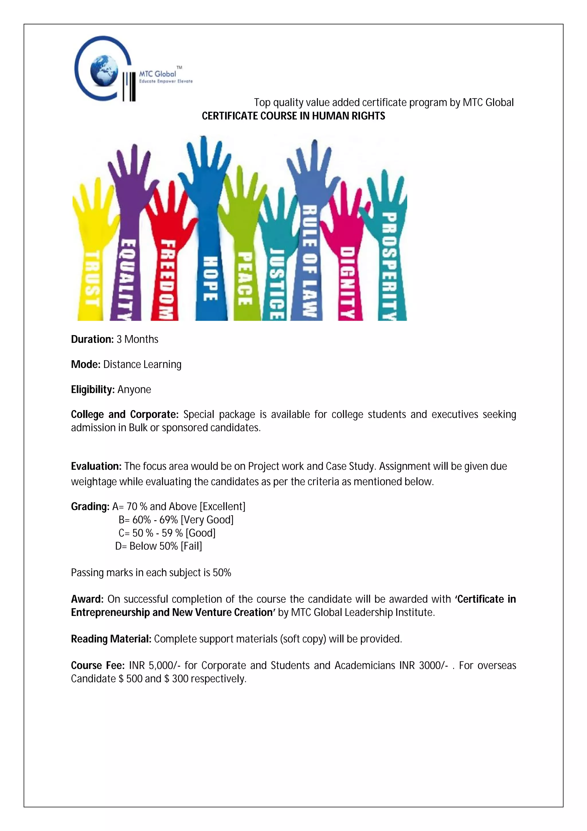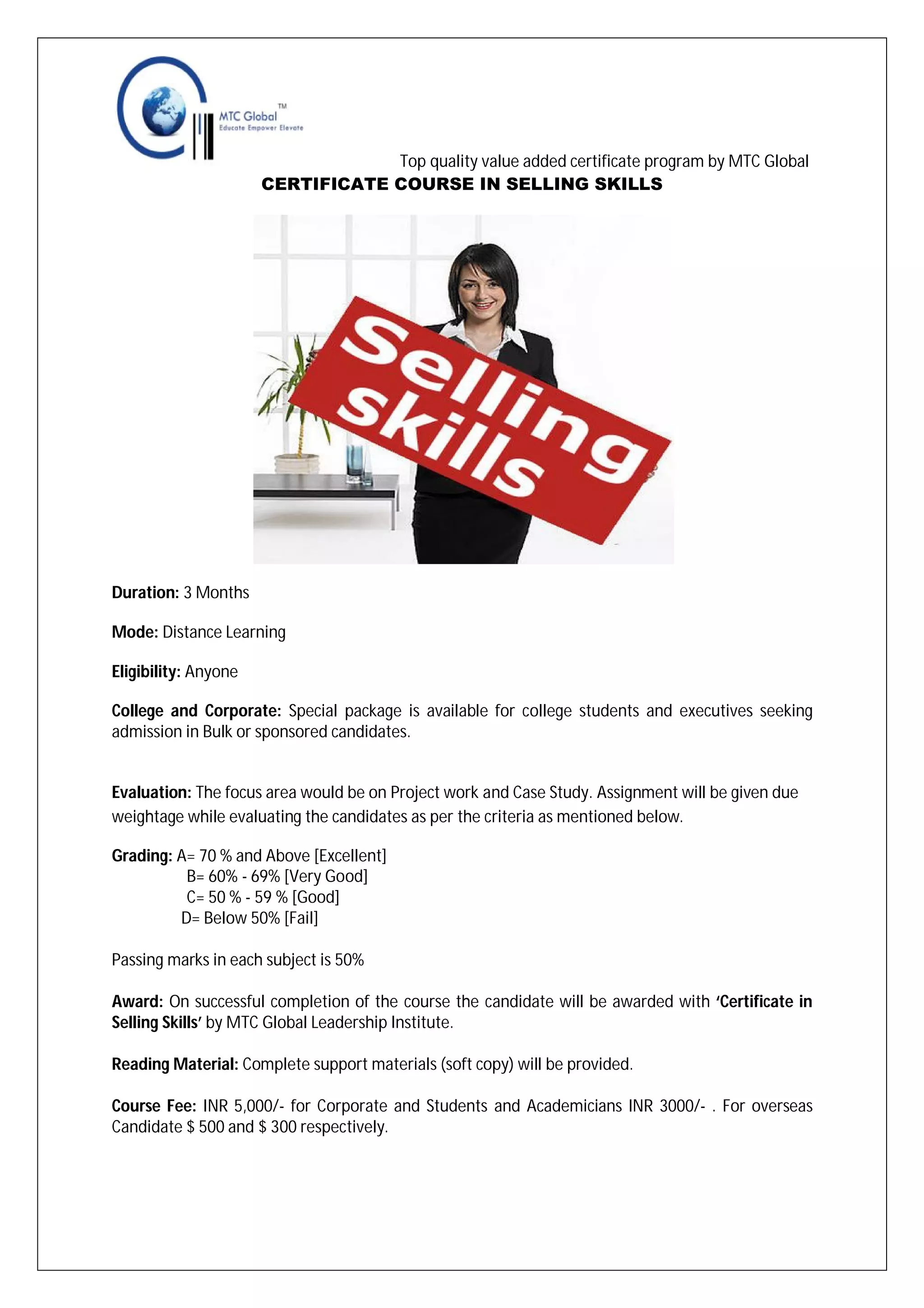 MTC Global offers 3-month distance learning certificate courses in various subjects including human rights, selling skills, entrepreneurship, customer relationship management, total quality management, and counseling. The courses are open to anyone and have special rates for college students, executives, and bulk/sponsored candidates. Candidates will be evaluated based on projects, case studies, and assignments. Upon successful completion, candidates will be awarded a certificate from MTC Global Leadership Institute. Course fees are INR 5,000 for corporate/students and INR 3,000 for academicians in India, or $500 and $300 respectively for overseas candidates. For more information on admission or queries, contact the specified representative.