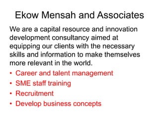 The document discusses how to add value to oneself through self-realization, identifying one's purpose and role, seeking clarification, adding value to others, properly packaging and presenting oneself, and maintaining relevance. It provides pointers for each area, such as understanding one's uniqueness, finding fulfillment through prayer and mentors, becoming well-educated, and maintaining integrity and focus. The overall aim is to equip individuals with the necessary skills and information to be successful and make meaningful contributions.