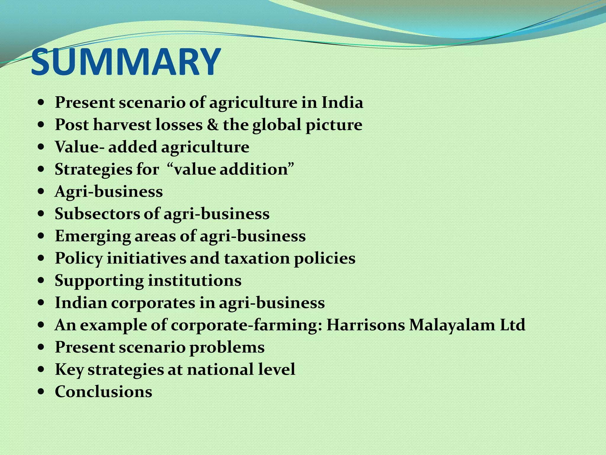 - The document advocates for strategies like expanding processing levels, modernizing food processing sectors, and promoting seamless value chains to reduce losses and add more value to agricultural commodities in India.