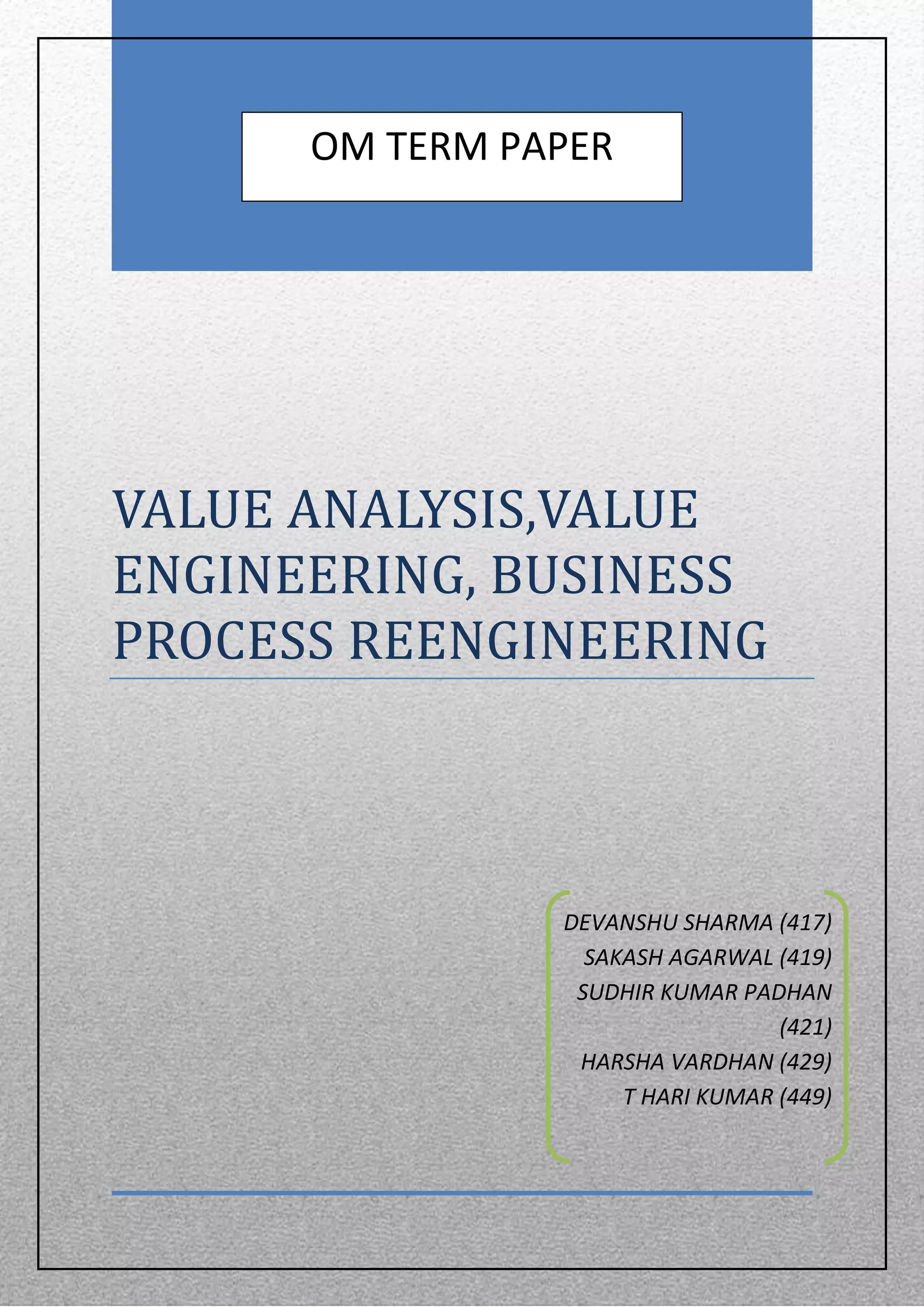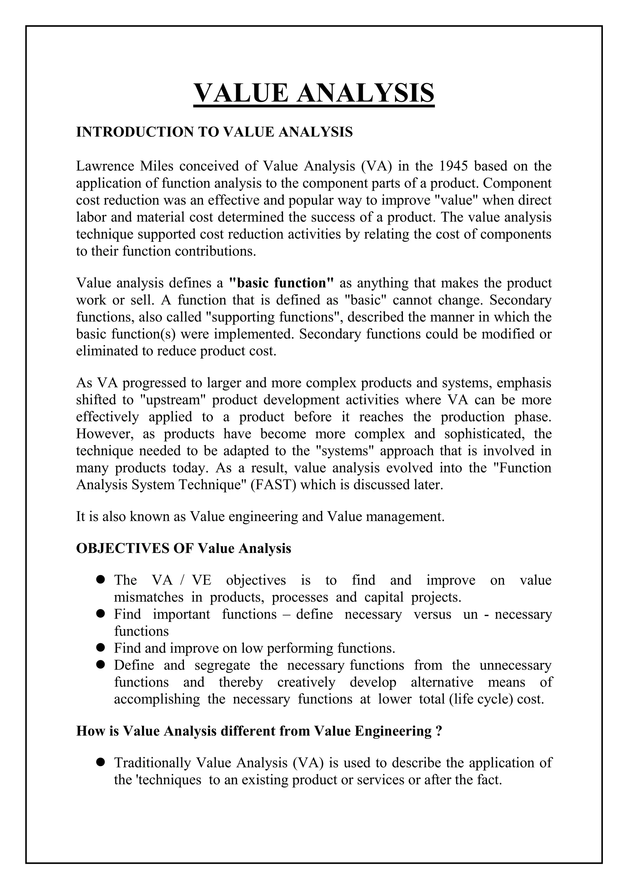 Value analysis and value engineering are techniques used to increase the value of products, processes, and projects. Value analysis focuses on existing products and value engineering focuses on new products during development. Both techniques involve identifying necessary functions, establishing the value of each function, and finding ways to deliver necessary functions at the lowest total cost over the product's life cycle. The value analysis process involves an eight-step job plan to systematically analyze products and identify opportunities to improve value. The objectives are to reduce costs while maintaining or improving necessary functions.