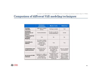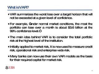 Value at Risk (VAR) summarizes the worst potential loss over a target period at a given confidence level, accounting for risks across an institution. VAR is calculated using statistical techniques to estimate losses that may occur but are unlikely to be exceeded. It is used to measure market, credit, operational and enterprise-wide risk and determine capital requirements to withstand unexpected losses.