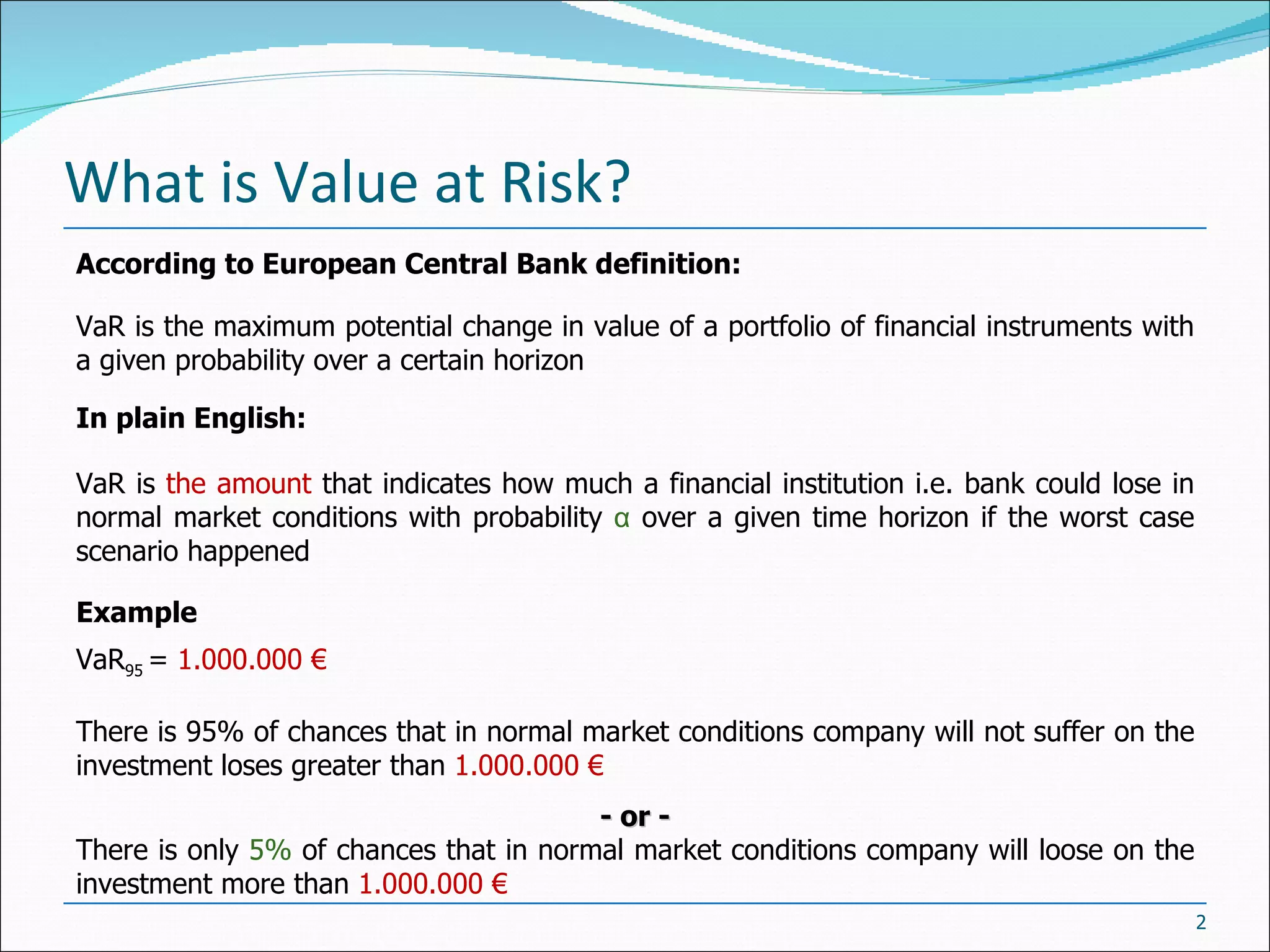VaR is a method used by financial institutions to measure and manage exposure to risks. It estimates the maximum potential loss over a specific time period with a given level of confidence, such as 95%. For example, a 1-day 95% VaR of €9,600 for a €1,000,000 EURPLN position means there is a 5% chance of losing more than €9,600 based on historical data of daily changes. VaR provides a simple single number to measure risk but does not indicate the scale of losses beyond the VaR amount or account for non-normal market conditions.