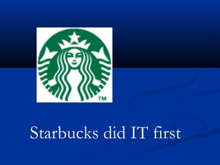 Starbucks was an early adopter of information technology, implementing systems like wireless payment and mobile ordering before other companies. They saw technology as key to improving the customer experience and operations of their stores. While other retailers were slow to embrace new technologies, Starbucks used IT to gain a competitive advantage through innovations that made their business more efficient and customers' experiences more convenient.