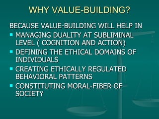 The document discusses using mobile technology (M-technology) to promote value-building in society. It argues that M-technology can help manage duality at a subliminal level, define individuals' ethical domains, and constitute society's moral fiber. M-technology refers to electronic devices, mobile devices, and implanted devices. It also discusses how M-technology can articulate expectations, connect various sectors of society, and consolidate research to rebuild confidence in humanity by circulating value-laden messages. The document outlines how M-technology and an M-society could utilize informational inputs, governance, and strategy to transform society in an ethically aligned manner.