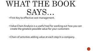 This document discusses using value chain analysis and value engineering to reduce costs for an army. It proposes six ideas to redesign a sword's hilt to reduce the material cost by at least Rs. 20 without compromising functionality. These ideas include reducing part counts, commonalizing rivets, benchmarking designs from other armies, using alternative cheaper materials, reducing weight, and improving manufacturing yields. Testing the new design could save Rs. 10 lakhs annually without raising taxes. The emperor decides to teach value engineering techniques to engineers in the army's four divisions to identify cost-saving redesigns worth Rs. 25 lakhs each.