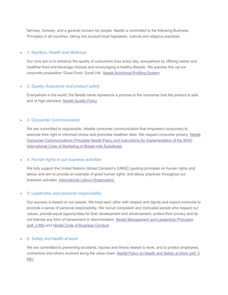 Nestle traces its origins back to 1866 with the opening of the first European condensed milk factory in Switzerland. In 1867, Henri Nestle launched an infant cereal that saved the life of a baby, establishing nutrition as the cornerstone of Nestle's business. Over subsequent decades, Nestle expanded internationally through mergers and acquisitions. Today, Nestle employs over 330,000 people across over 150 countries and has 461 factories worldwide. Nestle is committed to creating shared value for shareholders and society through its Corporate Business Principles focused on nutrition, health, sustainability and human rights.