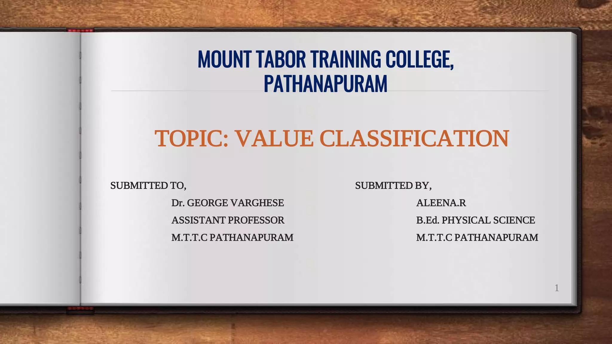 The document discusses various classifications and types of values. It summarizes Rokeach's value survey which separates values into two categories: terminal values, which are desirable end-states or goals; and instrumental values, which are preferable modes of behavior to achieve terminal values. It also outlines value classifications by Z.K Sajaranjiwallah based on biological, intrinsic and instrumental values, and by Eduard Spranger based on theoretical, economic, aesthetic, social, political and religious values. Finally, it lists different types of values such as aesthetic, material, personal, social, behavioral, spiritual, moral values as well as traditional Indian values and constitutional values.