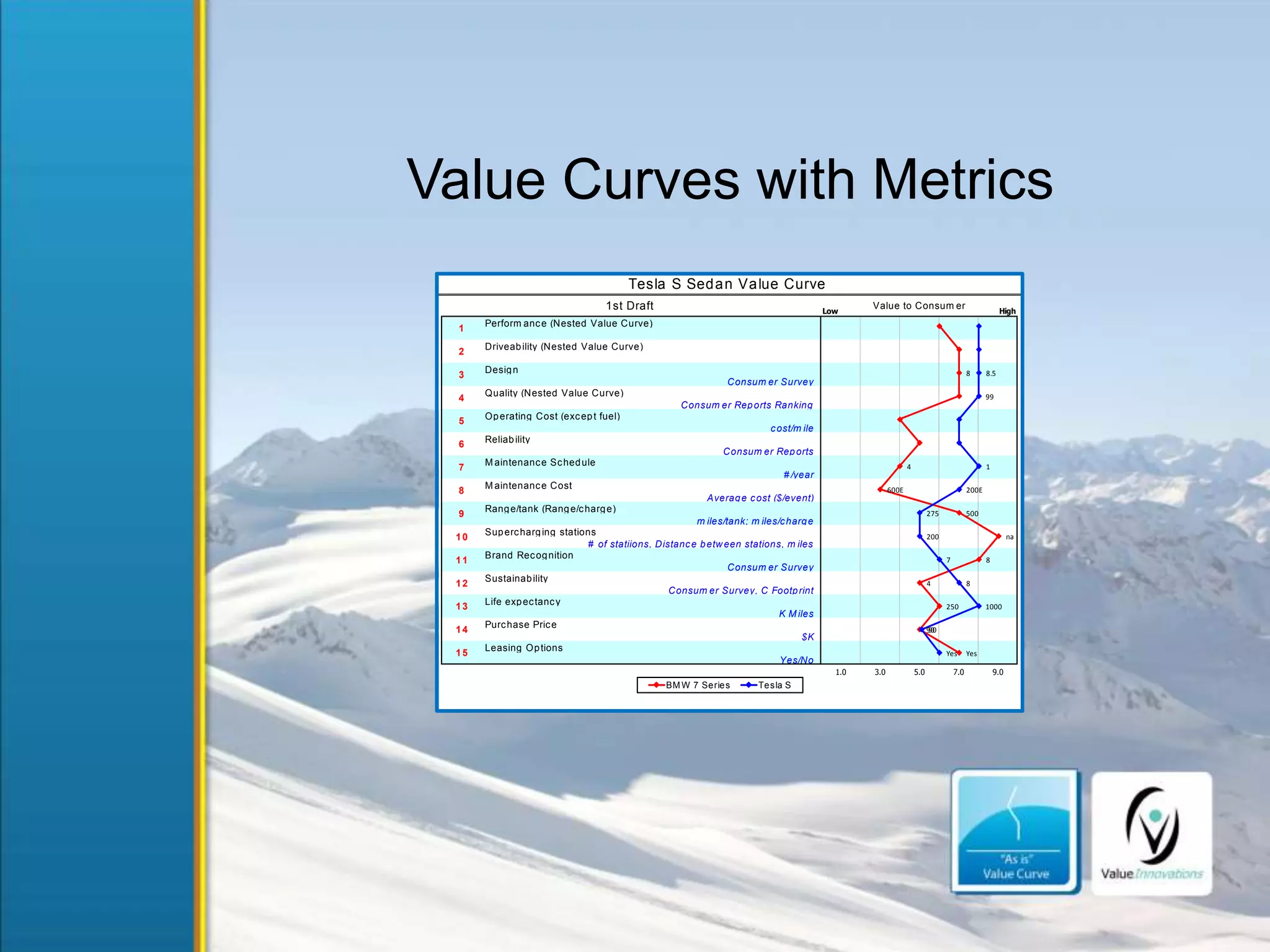The document discusses value curves and their metrics related to consumer perceptions of products, particularly the Tesla Model S, comparing it to competitors like BMW. It emphasizes the importance of defining clear project goals through ranked performance elements and metrics to understand consumer value and drive innovation. The value curves serve as tools for project teams to establish measurable objectives and engage with key stakeholders.