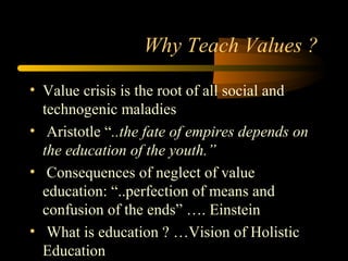 The document discusses the importance and challenges of value education, emphasizing that the neglect of values can lead to societal issues. It argues against the notion of value-neutral education and stresses the role of educators and families in fostering values through practical training and self-analysis. The text highlights the evolutionary perspective on human consciousness and values needed for fulfilled living, urging the need for educators to be role models and to incorporate ethical considerations across all subjects.