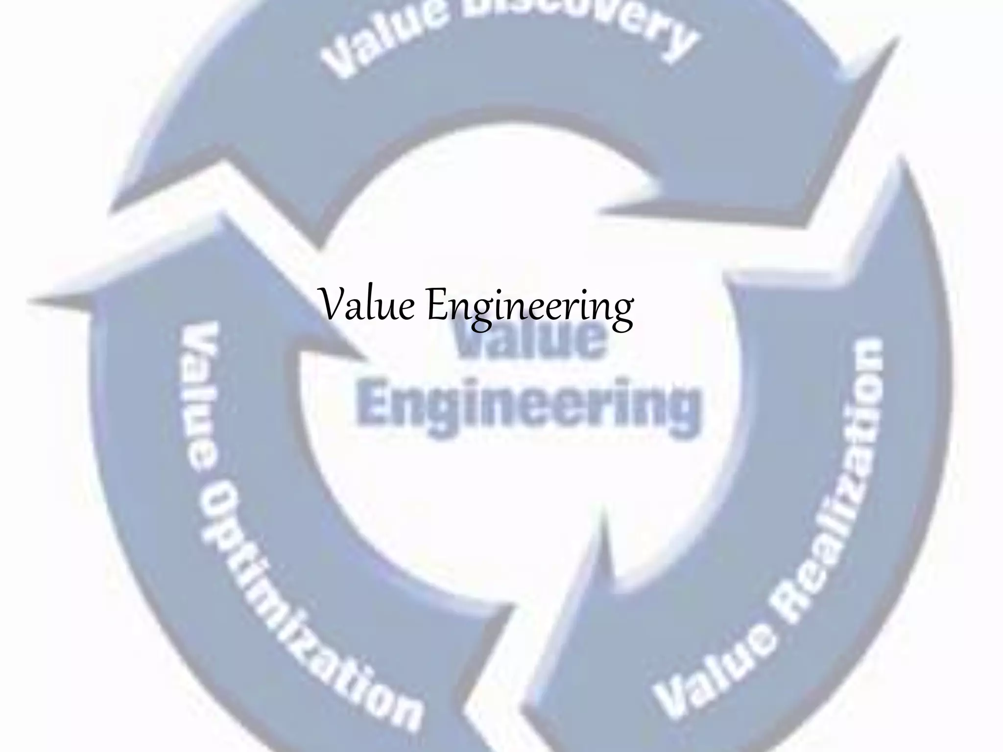 Value engineering is a systematic approach to reducing costs without compromising functionality. It focuses on identifying unnecessary costs and substituting cheaper alternatives. The value engineering process typically involves gathering information, generating alternatives, evaluating options, and presenting recommendations. Done effectively over several years, value engineering can significantly reduce construction costs for projects and homes, as demonstrated by a case study of a homebuilder that saved over $1 billion through value engineering methods.