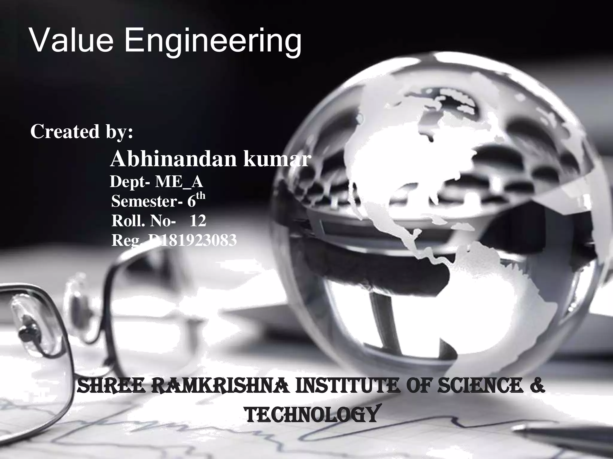 Value engineering is a technique that seeks the best balance between cost, reliability, and performance. It follows an 8-step job plan: orientation, information gathering, functional analysis, creative phase, evaluation, development, presentation, and implementation. The purpose is to reduce costs while maintaining or improving quality, reliability, customer satisfaction, and organizational performance. Early changes in a design are less expensive than later ones. Value engineering principles include using a systematic method and multi-functional teams to evaluate simplified product performance and value.