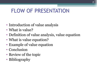 Value analysis is a technique to examine the functions of an item or product to determine if costs can be reduced while maintaining or improving functionality. The value equation defines value as benefits received divided by price paid. For example, the value of healthcare services can be calculated as the magnitude of patient improvement divided by the cost of care. Solving value equations and inequalities involves determining if the expression inside the absolute value is positive or negative.