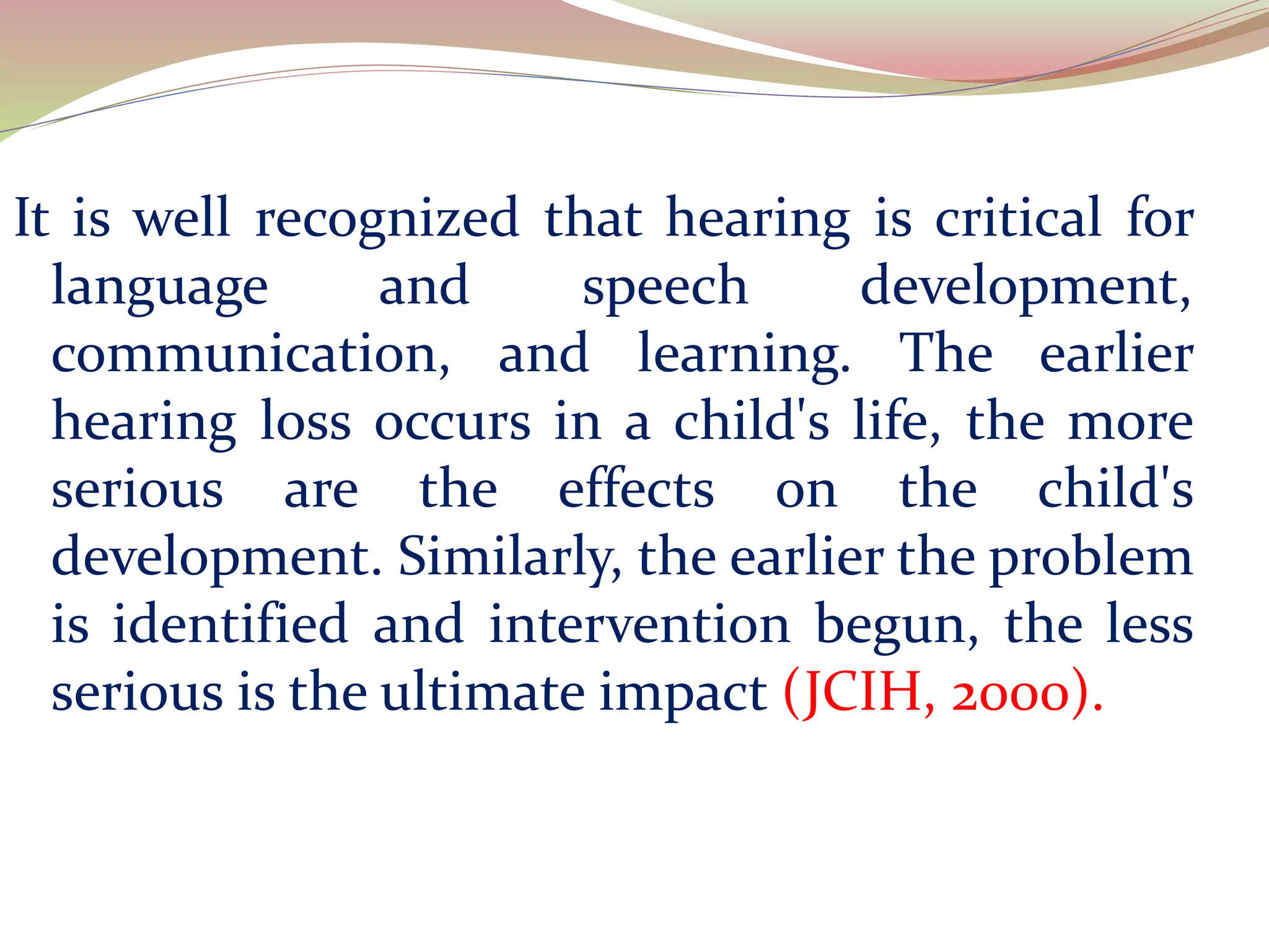 The document discusses the critical period for language acquisition in deaf children and the effects of early intervention. It summarizes a study that assessed language and speech outcomes in 58 deaf children who received hearing aids or cochlear implants at different ages. The study found that children who were amplified before 6 months of age achieved significantly higher language scores than those amplified between 6-12 months or 12-24 months. Children who received cochlear implants after 12-24 months showed better outcomes than those receiving hearing aids only, indicating electrical stimulation can still support language acquisition past the critical period. The document concludes early detection before 6 months is best for language outcomes, and cochlear implants may provide benefits even after 24 months.