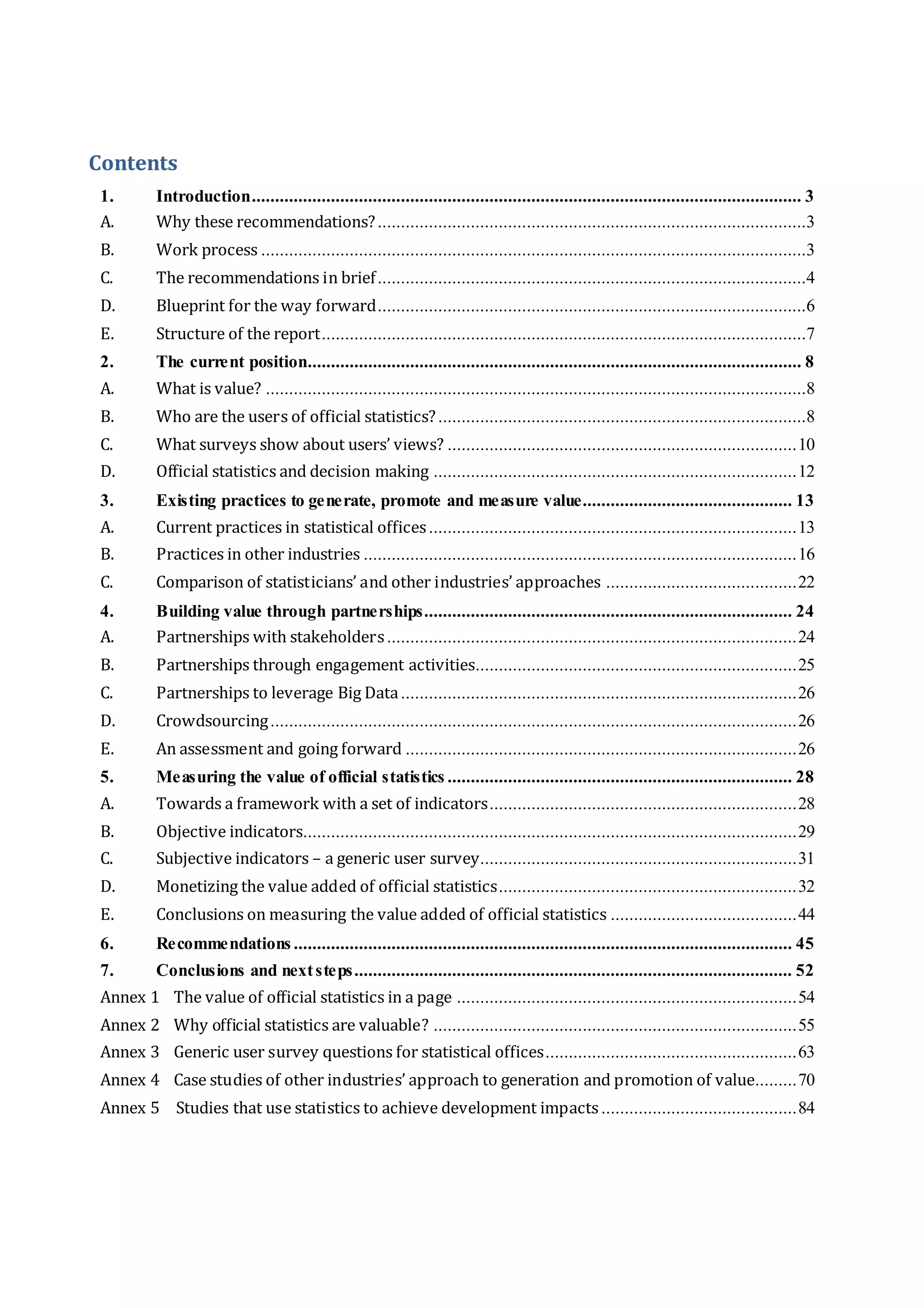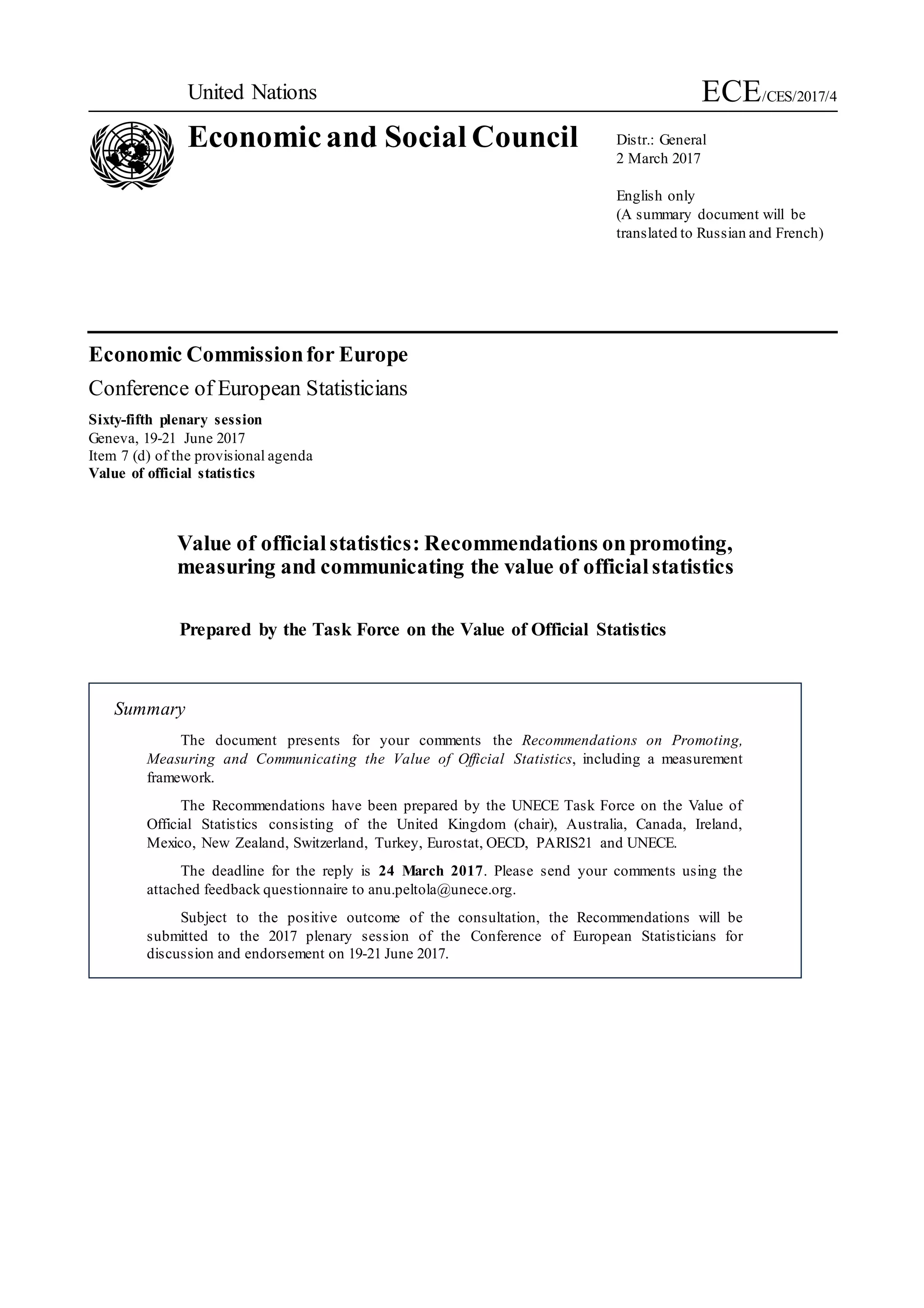 The document presents recommendations on promoting, measuring, and communicating the value of official statistics. It was prepared by a UNECE Task Force consisting of several countries and organizations. The recommendations aim to define what users and society value in official statistics and develop ways to measure this value. The key recommendations are to exploit the strengths of official statistics, put users at the center, design statistics for everyday use, promote innovation, form strategic partnerships, build the official statistics brand, and measure outcomes to demonstrate impact. Taking these steps could help ensure official statistics remain a valuable resource in the digital age.
