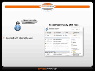 The document promotes the benefits of Spiceworks, a global community of IT professionals. It lists several ways users can get more out of Spiceworks, including connecting with others in groups, learning best practices, getting answers to IT questions, researching products and services, getting advice from peers, and getting started by filling out a profile and joining local SpiceCorps groups.