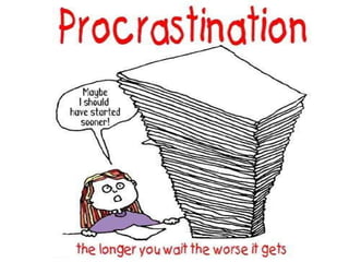 The document discusses time management and the value of time. It states that each day we are given 86,400 seconds in our bank account that must be used that day and cannot be carried over. It then provides examples of how valuable different units of time can be, from a year to a millisecond. The document stresses that every second counts and we should spend our time in an efficient and productive way. It identifies issues that can arise from poor time management like stress, low productivity, and performance declines. Finally, it provides some tips for better time management such as setting goals and priorities, planning, learning to say no, and practicing meditation.