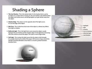 The document discusses the element of art called value. It defines value as the lightness or darkness of an object or surface. Value creates the illusion of three-dimensional form, texture, contrast between light and dark areas, and visual interest through variation. Different artistic mediums like graphite, charcoal, and ink can be used to render values. Value scales demonstrate the range of values. Techniques for applying value include shading, hatching, cross-hatching and stippling. Proper use of value is important for realistically depicting form. The document provides instructions for creating a value scale drawing to practice rendering values from light to dark.