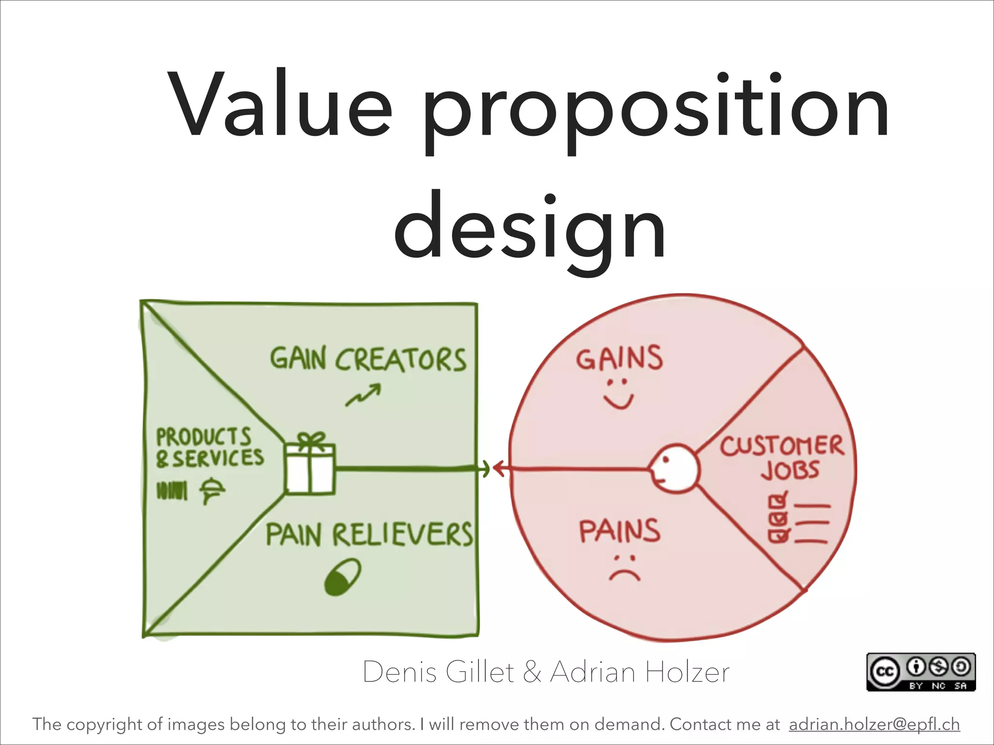 The value proposition canvas is a tool used to design, test, and build a company's value proposition in a structured way. It helps identify customer jobs, pains, and gains that the product or service can address. The canvas contains sections for products/services, pain relievers, and gain creators that deliver value to customers. It also considers competitors that may better address customer needs. The overall goal of the canvas is to achieve fit between what the company offers and what customers require.