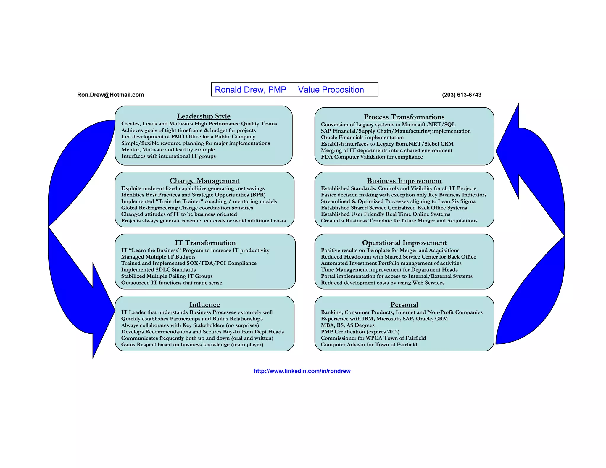 Ronald Drew is a project management professional with experience leading teams and implementing various systems and process transformations. He has expertise in transforming legacy systems to .NET and SQL, SAP implementations, and Oracle Financials. Drew is skilled in change management, business improvement, IT transformation, and operational improvement. He understands business processes extremely well and is able to quickly build relationships and secure buy-in.