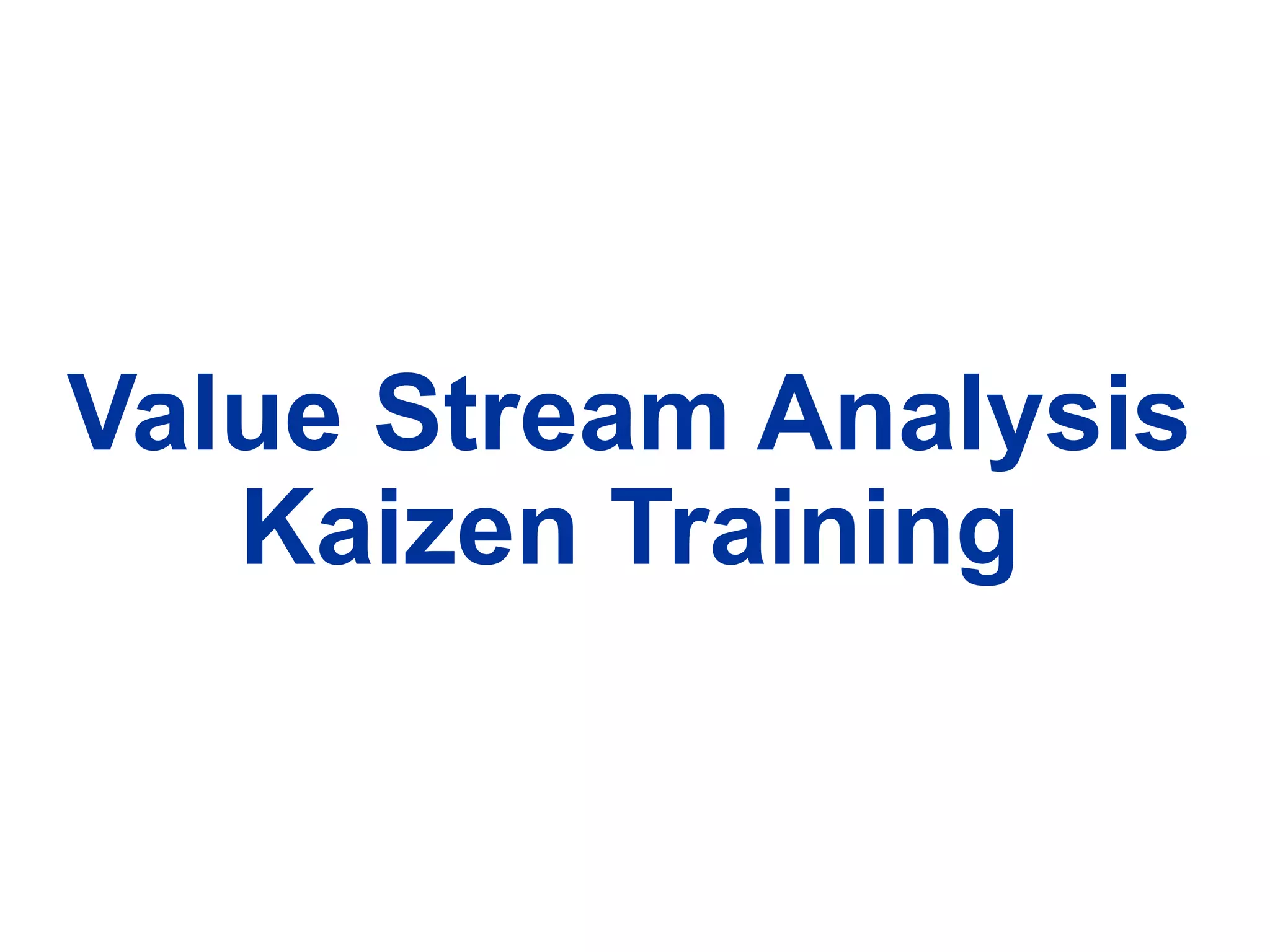 Value Stream Analysis Kaizen Training provides an overview of lean concepts and terminology, and details the value stream analysis process. The process involves 3 phases: pre-event planning, the main event where current, ideal and future state value stream maps are created, and an accountability process. Key elements of the training include identifying value-added vs. non-value added activities, eliminating waste, developing future state plans, and setting short-term goals for improvement.