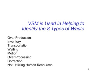 The document discusses Value Stream Mapping (VSM) as a method to identify and eliminate waste in manufacturing processes by analyzing the flow of materials and information. It outlines a total system strategy that requires leadership, knowledge, and action bias to succeed, and provides guidelines for mapping current and future states of the value stream. The process involves understanding customer demand, mapping processes, and strategizing improvements to enhance operational efficiency and reduce waste.