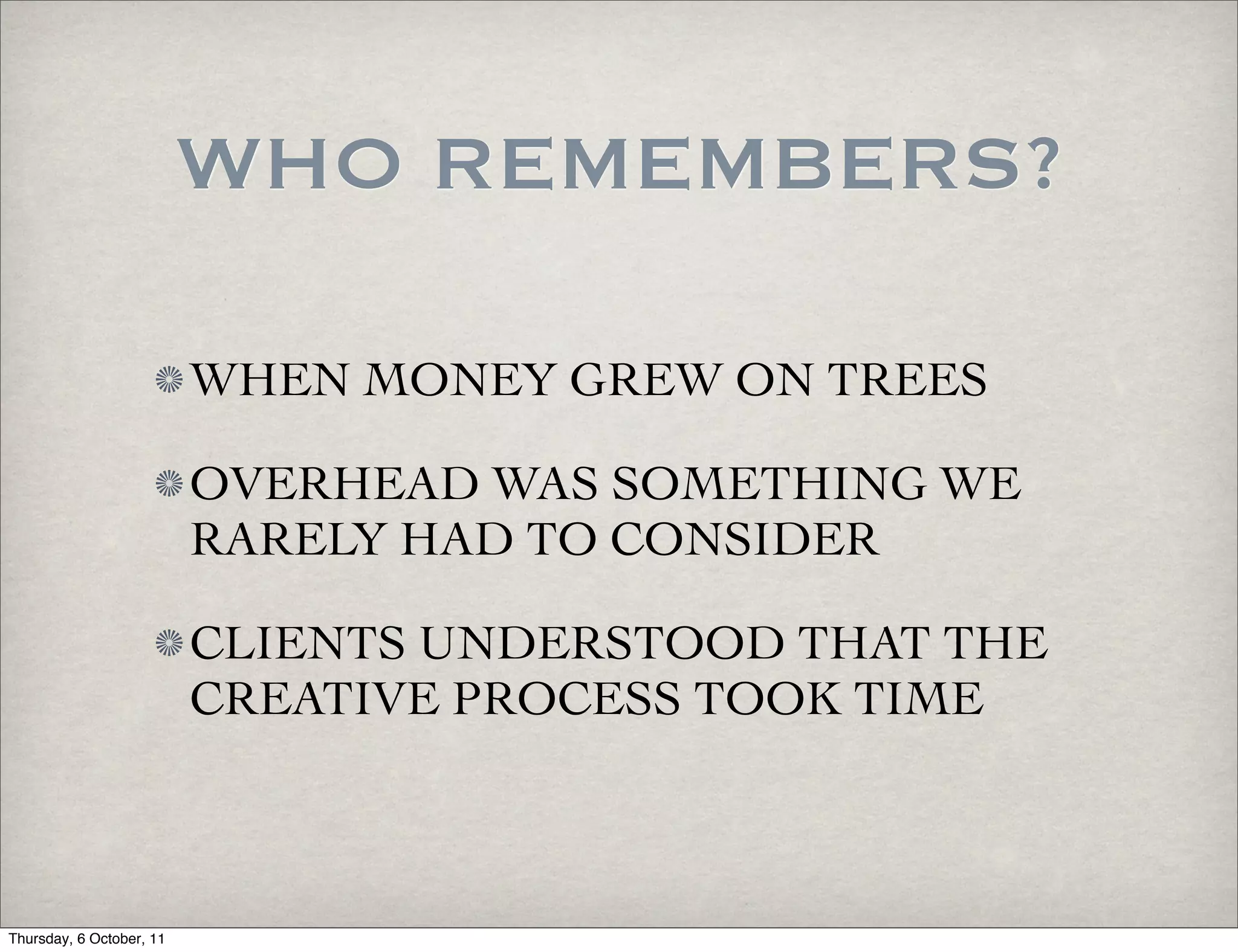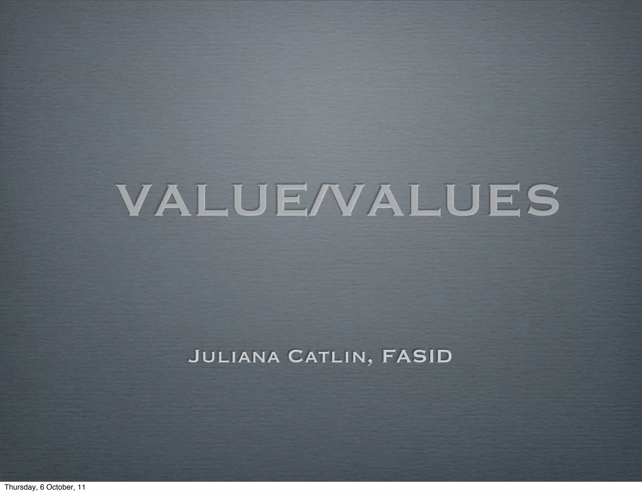 The document discusses the importance of values, both personal and business values. It explores how authenticity, relationships, and stories are key values that define individuals and companies. Focusing on people skills rather than just professional skills is emphasized as critical for building strong, loyal relationships and teams through open communication. Sharing one's unique talents and stories in an authentic way can help distinguish a company and allow them to provide better service through truly understanding clients and their needs.