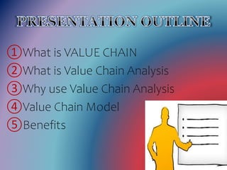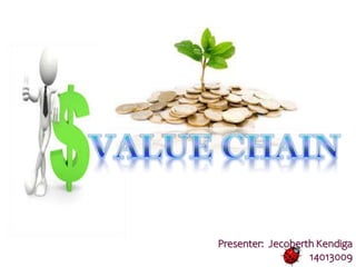 Value chain analysis examines all business activities, from procurement of raw materials to delivery of the final product or service. It aims to maximize value for customers while minimizing total costs. The value chain framework divides activities into primary and support activities. Primary activities include inbound logistics, operations, outbound logistics, marketing and sales, and service. Support activities are firm infrastructure, human resource management, technology development, and procurement. Understanding the value chain can help businesses identify areas for improvement and create competitive advantages.