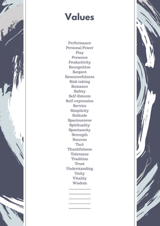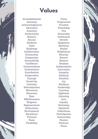 The document lists 100 values including accomplishment, accuracy, acknowledgement, adventure, aesthetics, authenticity, balance, beauty, boldness, calm, challenge, collaboration, community, compassion, comradeship, confidence, connectedness, contentment, contribution, cooperation, courage, creativity, curiosity, determination, directness, discovery, ease, effortlessness, elegance, empowerment, enthusiasm, environment, excellence, fairness, fame, flexibility, focus, forgiveness, freedom, friendship, fun, generosity, gentleness, growth, happiness, harmony, health, helpfulness, honesty, honour, humour, idealism, independence, innovation, integrity, intimacy, intuition, joy, kindness, leadership, learning, lightness