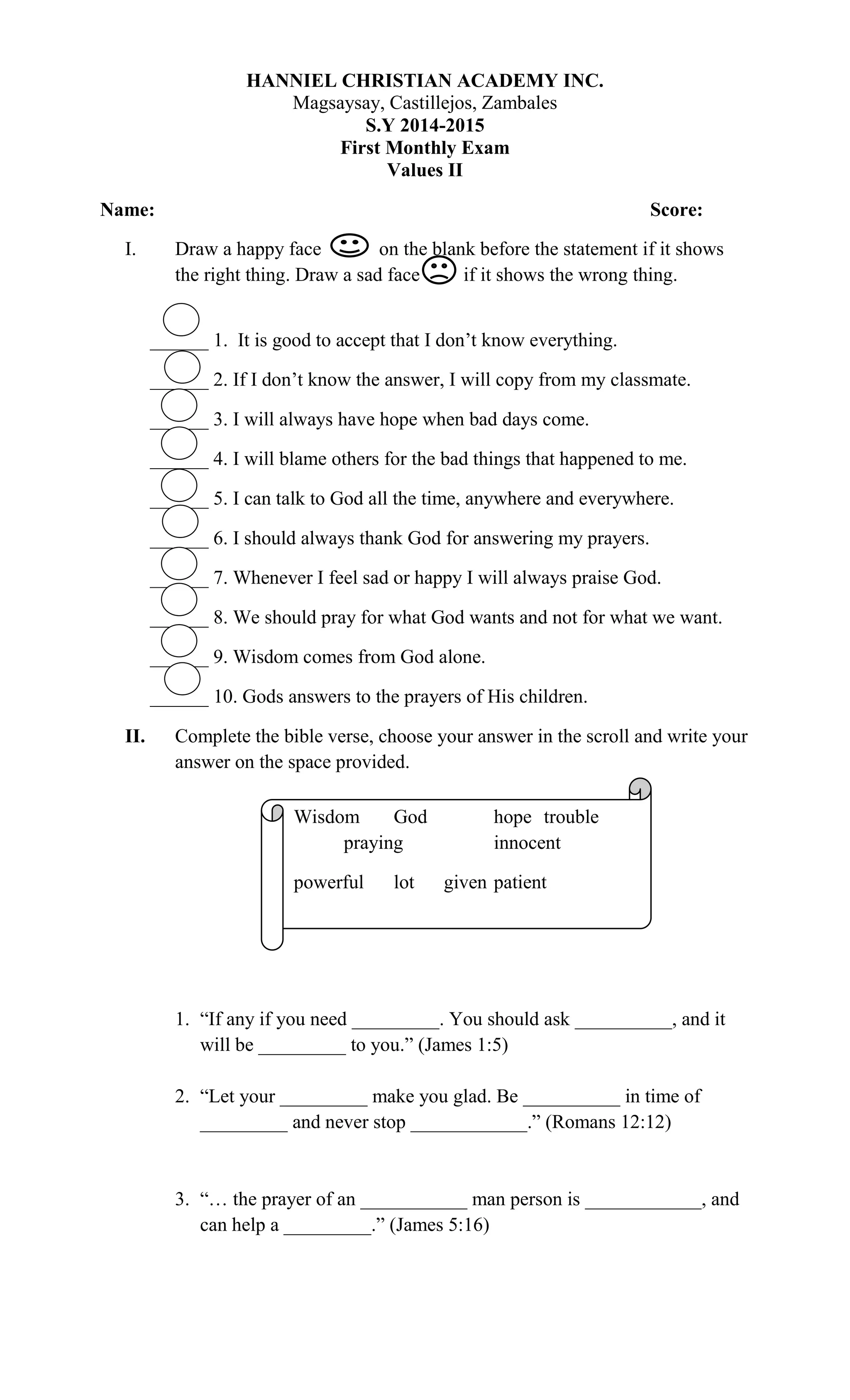 This document contains a monthly exam on Values II for students at Hanniel Christian Academy. The exam has three sections: