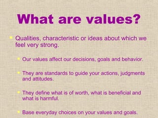 The document discusses values and what they are. It states that values are qualities or ideas that people feel strongly about and that give meaning and purpose to life. Values guide decisions and behavior. They come from many influences throughout life, especially from parents, teachers, peers, and personal experiences as one ages. The document outlines different types of values like moral, aesthetic, material, intrinsic, extrinsic, universal, and group-specific values. Living according to one's values is important for achieving goals.